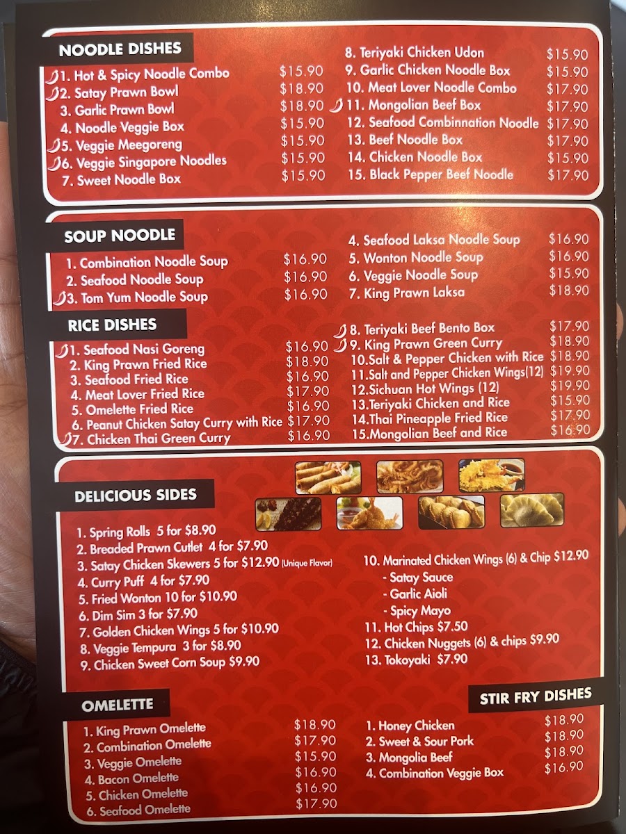 Spicy. A combination of prawn, chicken, and vegetables stirred with Indonesian-style spice.