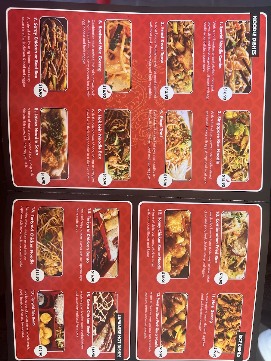 Spicy. With a combination of beef, chicken, roast pork, and fresh vegetables, all tossed with egg noodles in our delicious spicy sauce.